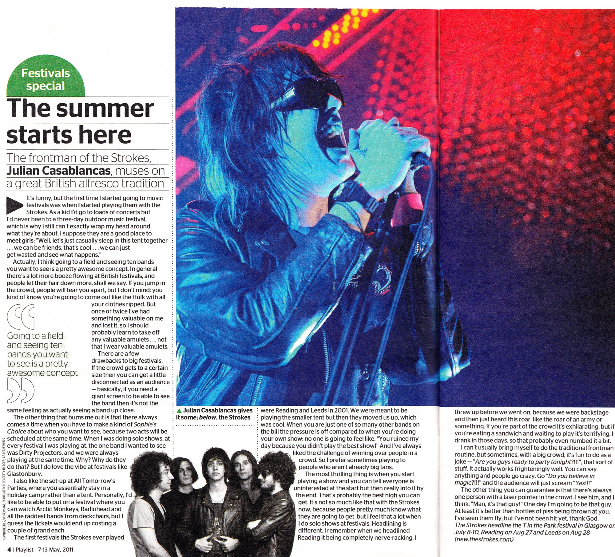 “É divertido, mas a primeira vez que fui a um Festival, foi para tocar com os Strokes”. Julian Casablancas disse ao The Times o quanto gosta de tocar em Festivais. Ele conta sobre suas impressões e o que acha da idéia de ter várias bandas num mesmo lugar.