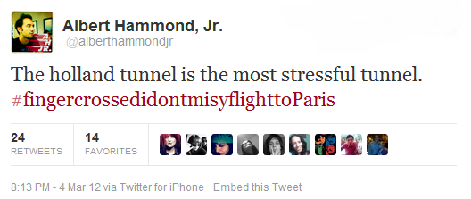 “O holland tunnel é o túnel mais estressante #fingercrossedidontmisyflighttoParis“. Na hashtag acho que ele quis dizer “finger crossed i dont miss my flight to Paris“, ou seja, “dedo cruzado para que eu não perca meu vôo a Paris“.