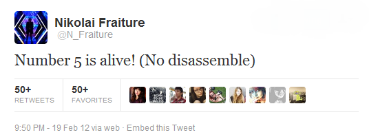 O tweet diz “Número 5 está vivo! (Sem desmontes)” e é uma citação do filme Short Circuit, de 1986, e aí fica a dúvida, estaria o Nikolai nos trollando?