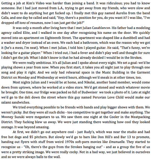Foi só depois de um mês morando aqui que eu encontrei Julian Casablancas. O pai dele tinha uma agência de modelos chamada Elite, e eu entrei lá certo dia quando reconheci o nome dele na porta. Nós rapidamente nos mudamos para um apartamento na Eighteenth Street. O apartamento tinha o formato de um haltere e tinha uma máquina de lavar e secar em vez de um forno. Tínhamos um banheiro cada um, o que foi a razão de ficarmos nele (ele é uma bagunça e eu sou organizado). Quando conheci o Julian contei para ele que tocava guitarra. Ele disse, “Engraçado, nós estamos procurando um guitarrista.” Quando fui fazer o teste, tive febre e não toquei bem e pensei que com certeza não teria o emprego. O que eu não sabia é que ele já havia decidido que eu seria parte da The Strokes.